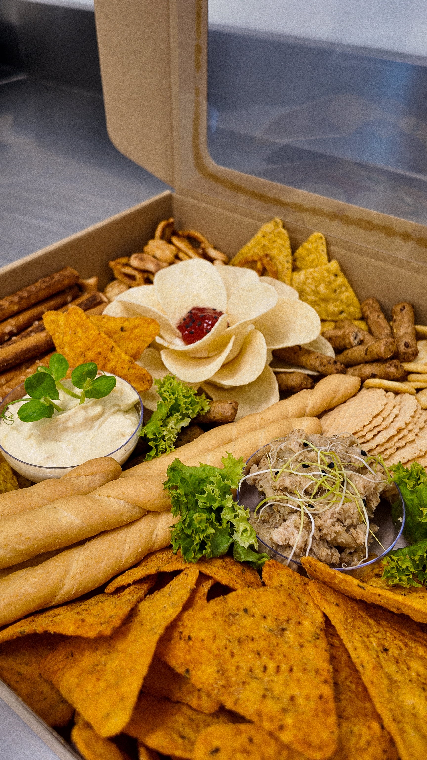 Zloženie: 2 druhy nátierok podľa Vášho výberu, slané krekry, slané tyčinky, nachos, praclíky.